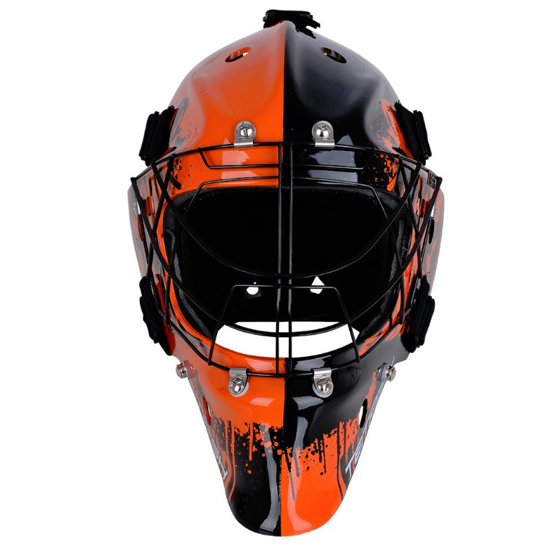 Profesionálna brankárska maska ​​HERO je v prevedení SENIOR. Maska je vyrobená z mimoriadne odolného ABS plastu určená pre potreby súťažných a profesionálnych hráčov. Je certifikovaná IFF. Nové anatomické polstrovanie bandážou na báze PE s nastaviteľnou ochranou brady. Čelo sa opiera o vymeniteľný savý pásik z materiálu CoolMax, ktorý sa výborne stará o odvod potu. Maska sa perfektne prispôsobia každému tvaru hlavy a tváre vďaka konštrukcii, tvaru skeletu, vnútorné bandáži a materiálu sťahovacích pások. Kvalitnejšie ventilácia vzduchu je umožnená pomocou správne umiestnených vetracích otvorov. Nový typ ochrannej mriežky I-SEE je vyrobený z odľahčeného, ​​ale dostatočne pevného nehrdzavejúceho materiálu, teda chráni tvárovú časť hlavy veľmi spoľahlivo. Oválny prierez drôtov zaisťuje perfektnú videnie hry. Pretiahnutá časť pod bradou chráni krk.