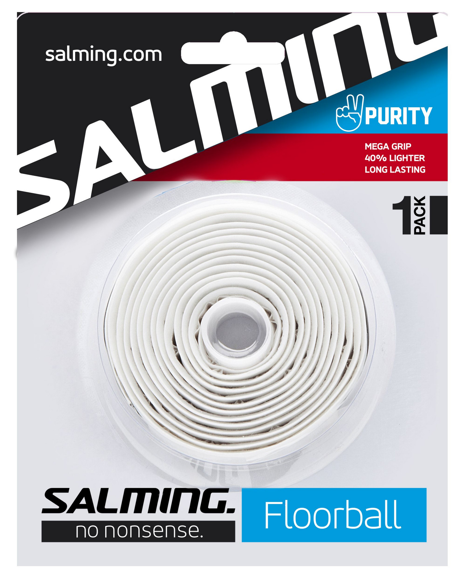 Profesionálne omotávka od značky Salming Purity grip vyniká medzi konkurenčnými omotávkami hlavne svojou nízkou hmotnosťou. V ponuke ju nájdete len v bielej farbe, pretože práve nefarebnou má tie najlepšie vlastnosti. Omotávka je váhovo porovnateľná s omotávkou Tourlite WetTac, je však trochu silnejší.