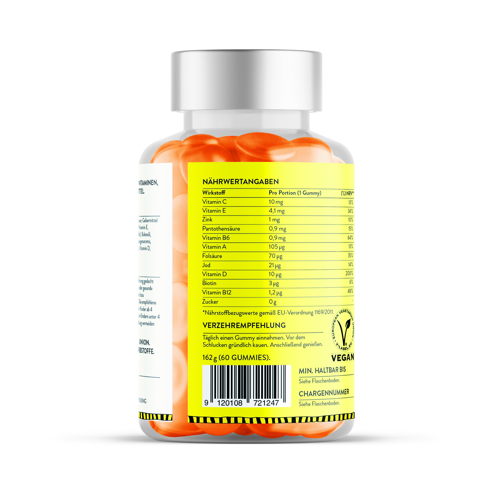 Každá dávka dvoch žuvačiek poskytuje prospešné množstvo vitamínu A pre zdravý rast a zrak, vitamíny skupiny B pre metabolizmus a zdravý vývoj buniek, vitamín C na podporu optimálnej funkcie imunitného systému, vitamín D pre silné kosti a vitamín E pre zdravie mozgu a poznávanie.