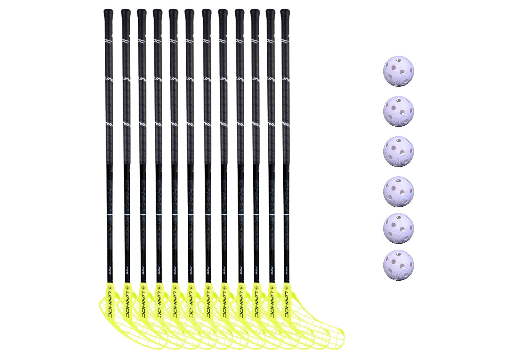 Florbalový set CHALLENGER 29 black je komplexná sada pre použitie v školách a športových kluboch. Florbalové palice v tejto sade sú rovné a na oboch stranách mierne konkávne. To znamená, že s florbalovými palicami možno hrať na ľavej aj pravej strane a sú teda vhodné pre širokú škálu typov hráčov. Vysoko kvalitný shaft a odolná rukoväť ponúka optimálne pohodlie a dobrý základ pre kompletnú hernú prípravu. Súčasťou sady sú aj florbalové loptičky Unihoc "Cr8ter", ktoré sa vyznačujú stabilnými letovými vlastnosťami, vysokou rýchlosťou streľby a presnými vlastnosťami prihrávok.